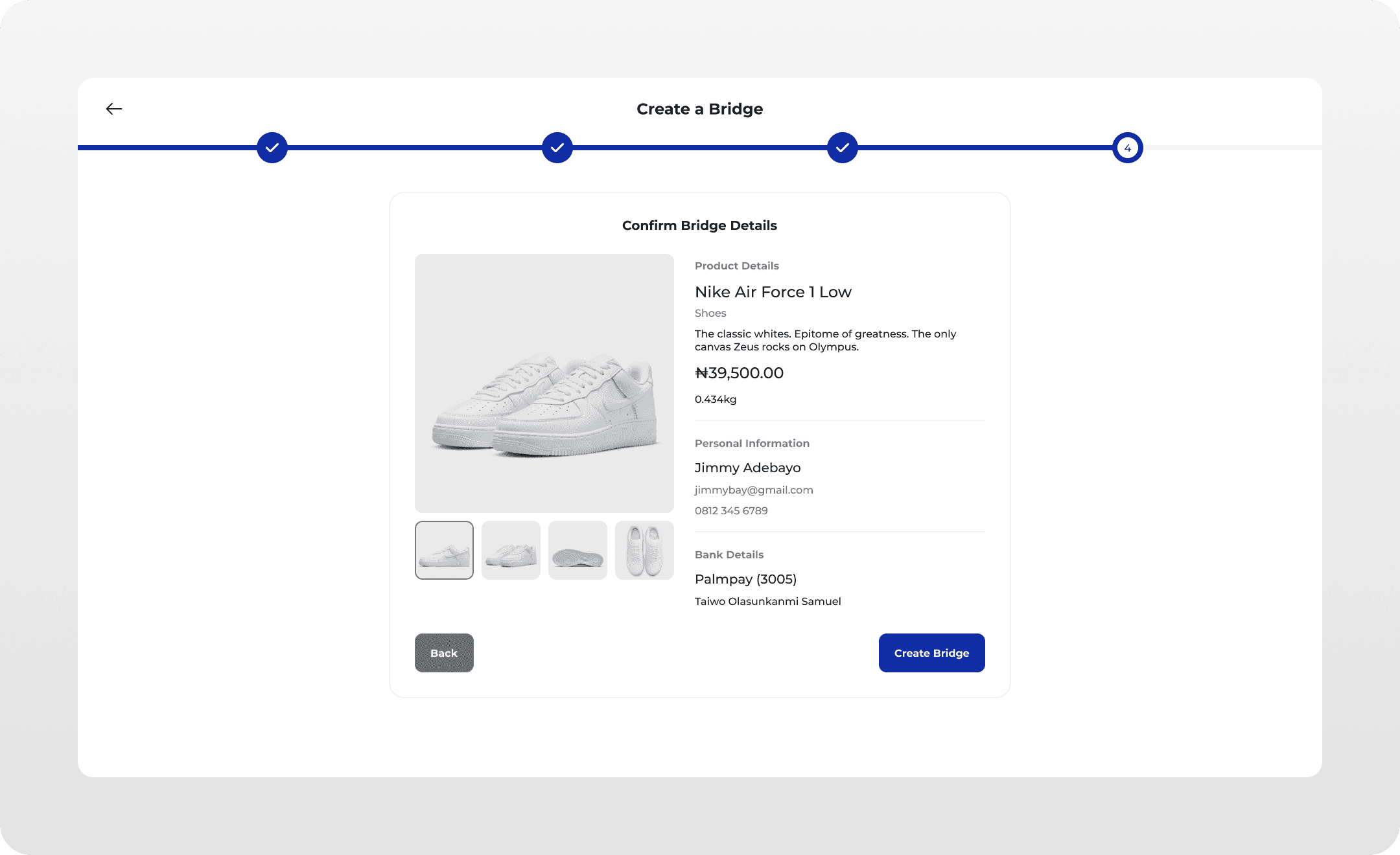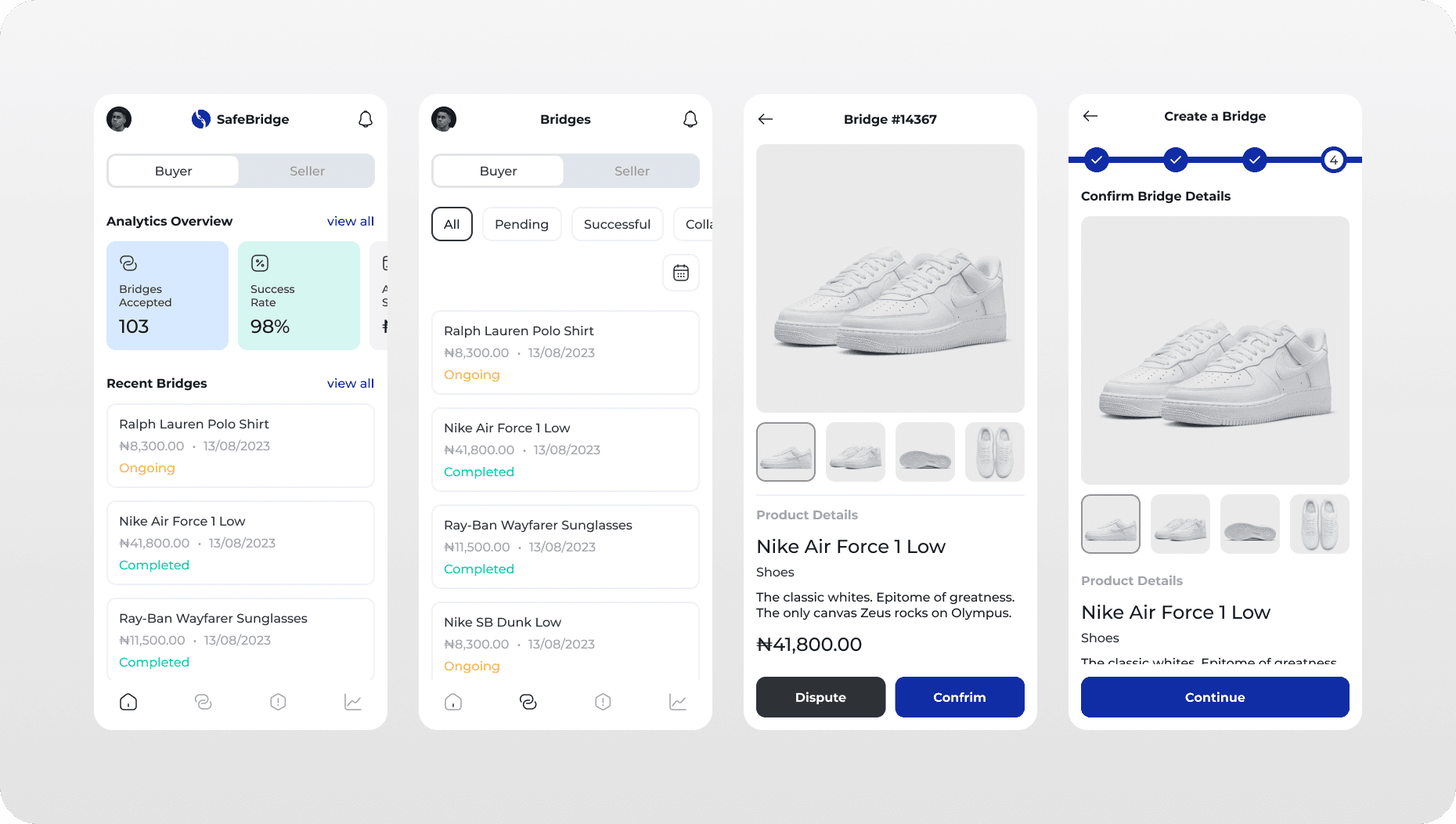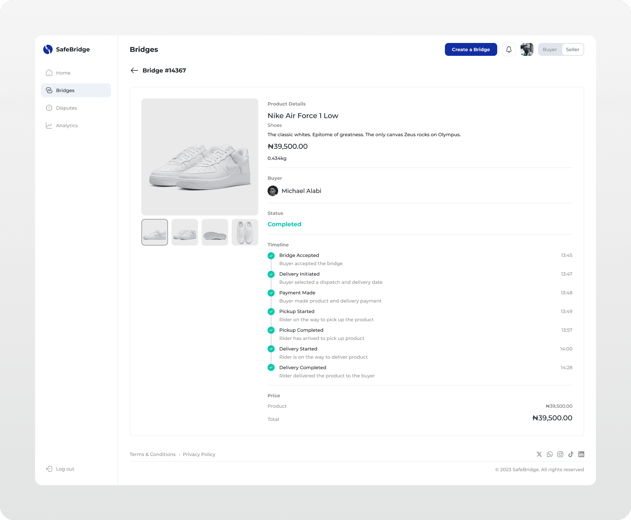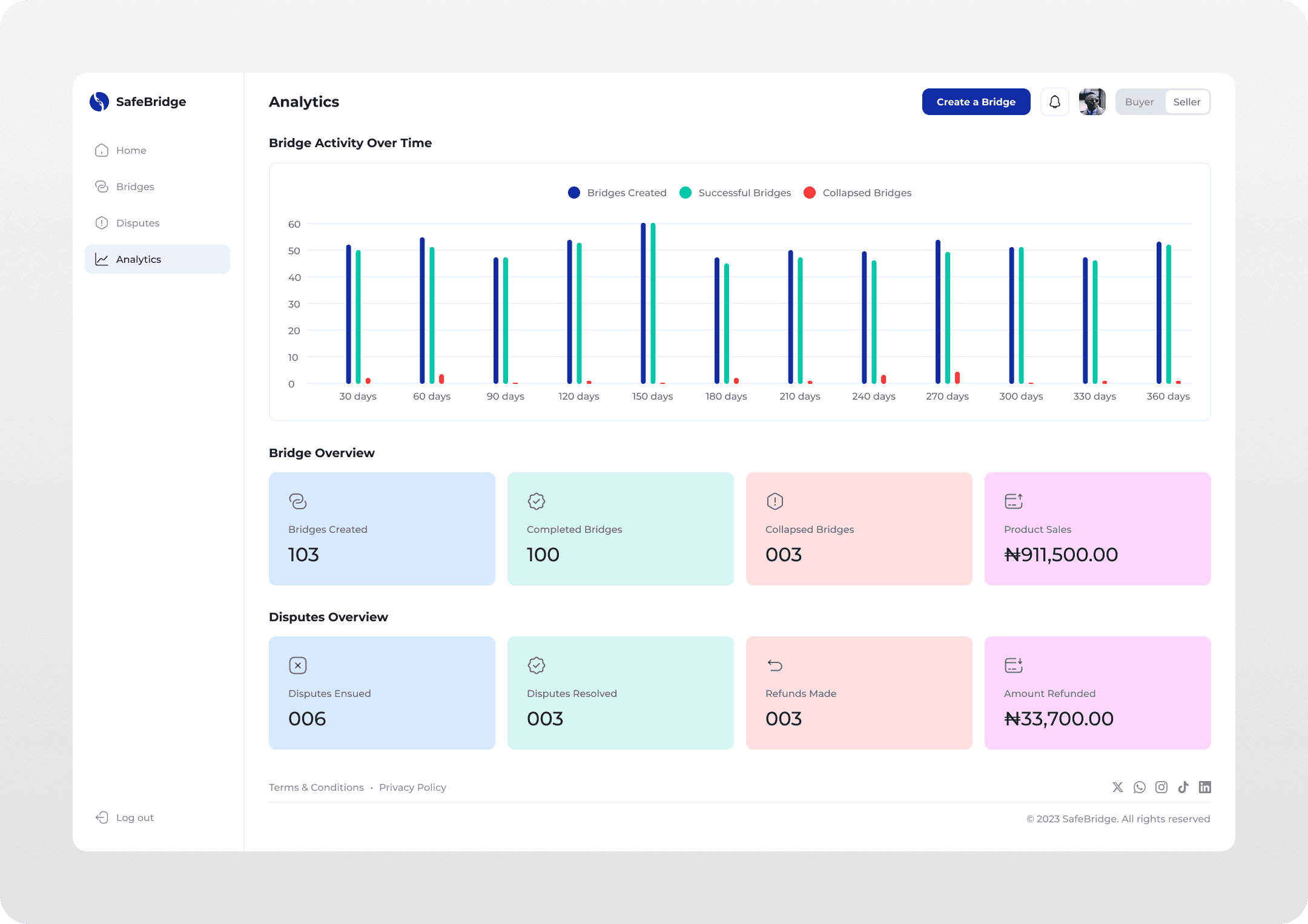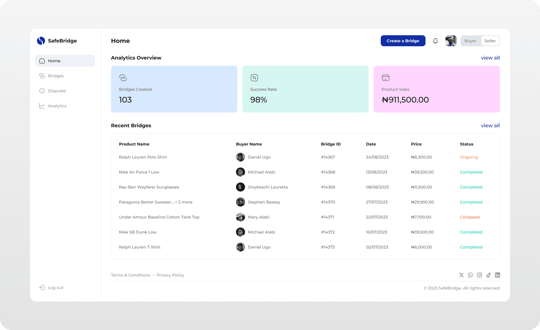 SafeBridge is a platform designed to facilitate secure transactions by being the centre ground that guarantees buyers' and sellers' needs are met before authorizing the completion of a transaction.